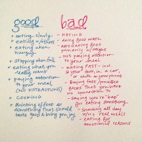 When we focus primarily on what we're eating so much, the how almost always suffers. It takes so much mental energy to remember the "can"s and "can't"s of a diet, or we become overwhelmed by the abundance of often-conflicting advice, and our food mindset becomes narrow and hyper-focused.